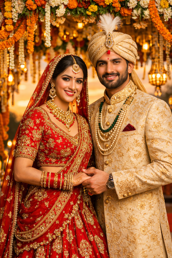 1. Romantic Indian bride and groom standing together under floral wedding mandap, sunset golden light, dreamy atmosphere.