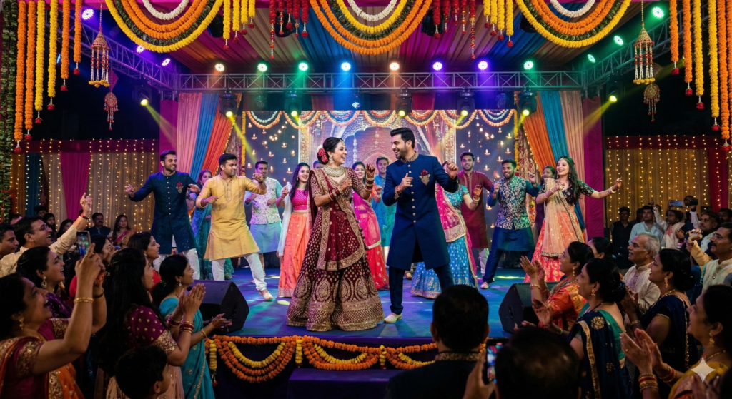 Indian wedding sangeet dance celebration with bride and groom dancing on stage, colorful lights, festive decorations, energetic atmosphere.