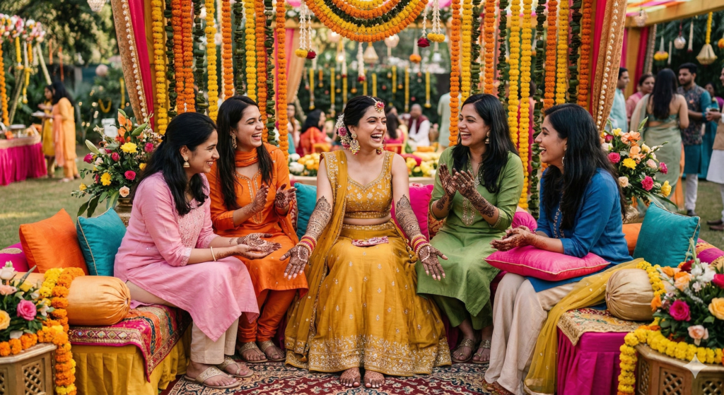 6. Bride sitting with friends during mehndi ceremony, vibrant outfits, floral decorations, joyful atmosphere, soft sunlight.